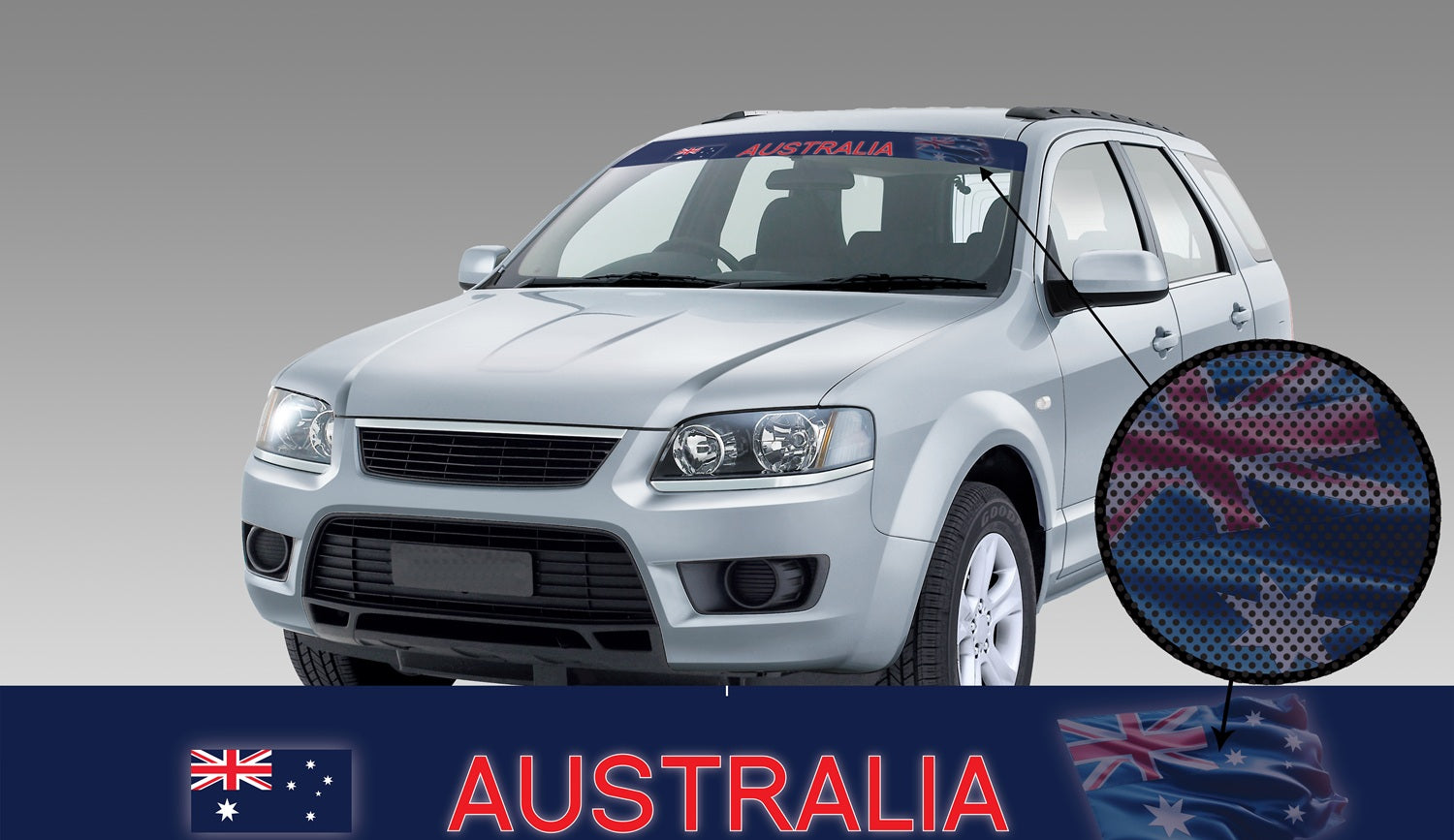 The See-Thru Sun Visor strip is an amazing Australian made decal that is printed onto a special perforated film called One Way Vision; allowing the driver to see through the strip, while people on the outside see the printed colour. It reduces glare like a 50% window tint when driving into the sun and is bubble free when it is being installed.
