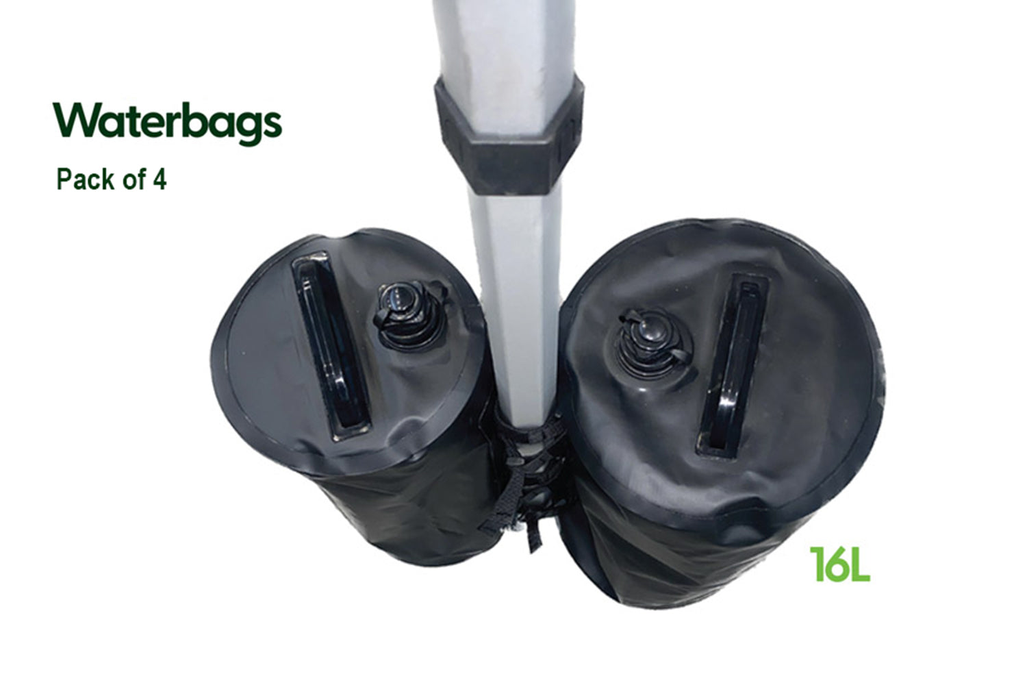 Waterbags are available in 16L size and come with velcro straps to attach to the gazebo frame posts. Four (4) waterbags are included in the pack, one for each frame leg.