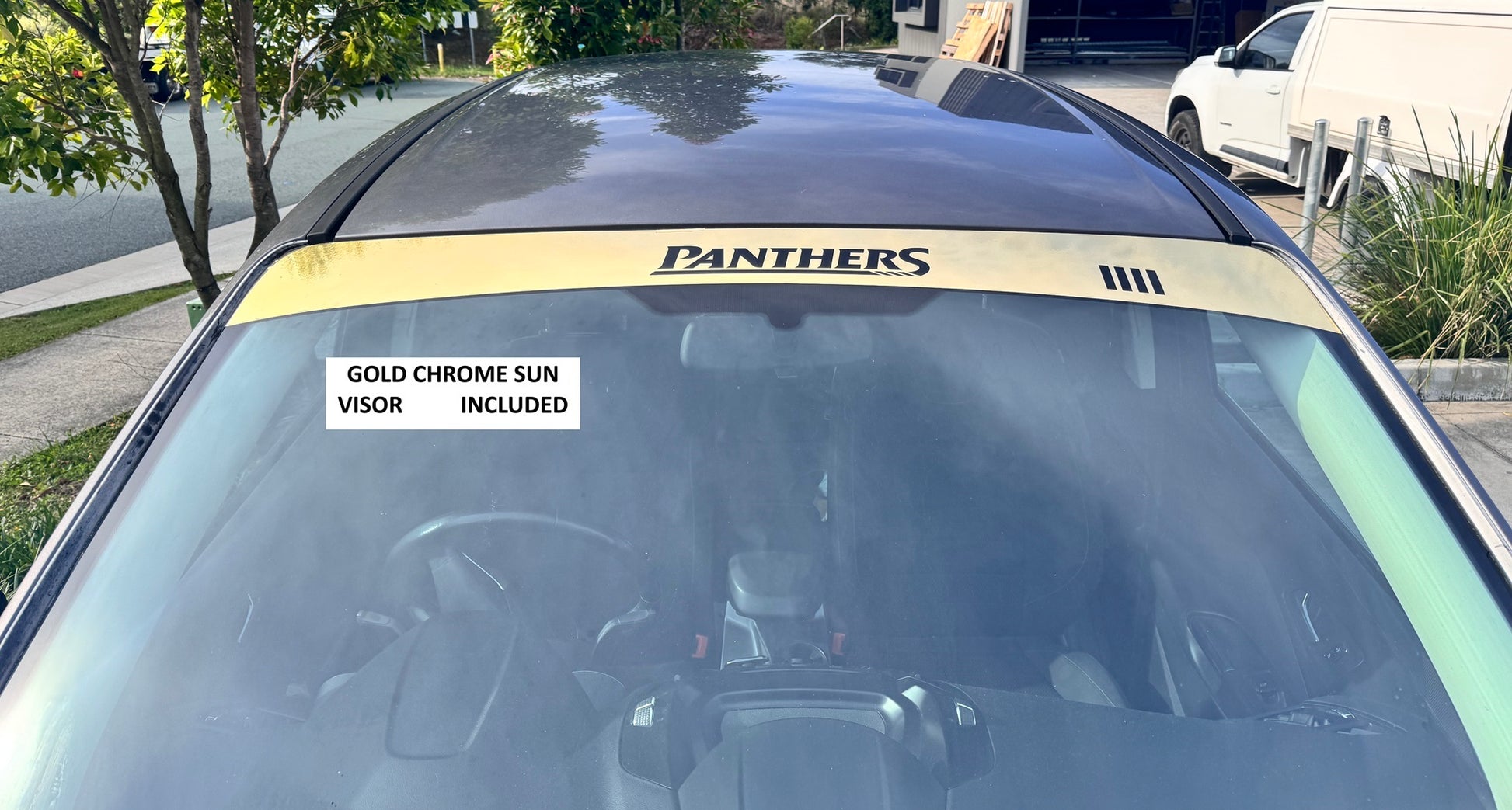 Buy these two separate products as a bundle and save. Black Panthers computer cut vinyl lettering and a solid gold sun visor. We will send to you in the one box, so you save on delivery and a reduced overall price compared to if you bought them separately. This allows you to place the Panthers name and 4 bars to the side of you prefer instead of the middle.